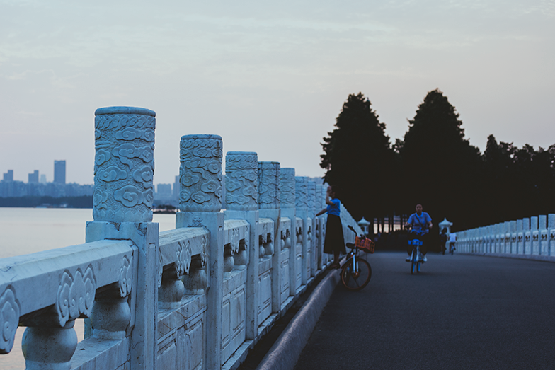 Before night people riding bicycles on a bridge over East Lake.